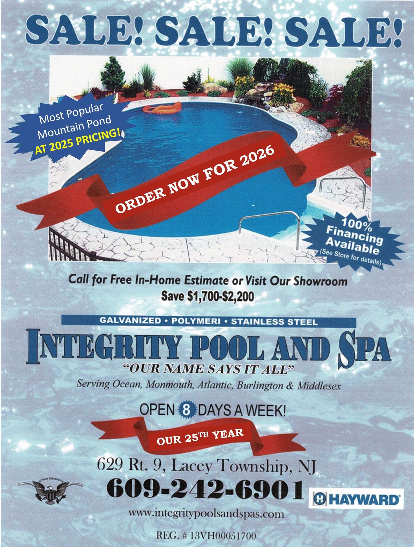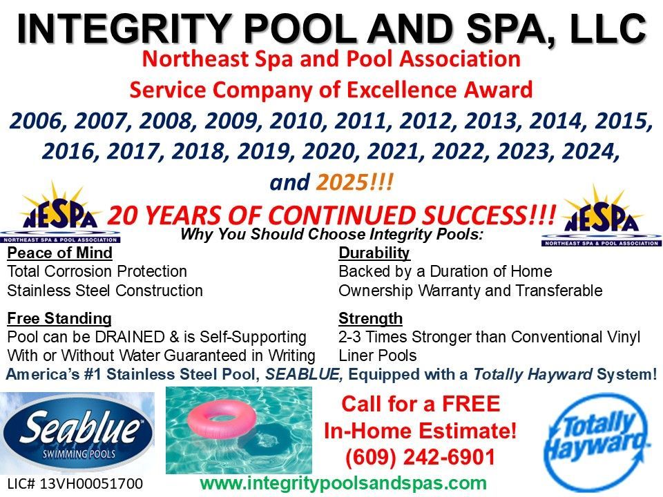 Integrity Pool and Spa is a family owned and operated company that is currently celebrating our 26th year in business. We specialize in in-ground pool installation, above ground pool installation, and spas, proudly serving Central, Southern, and Western NJ. Our retail store is the talk of the town in terms of the amount of pool supplies and parts we stock, our full lines of pool and spa chemicals, the plethora of toys and games we carry, and the many other pool and spa accessories we stock. We also have a beautiful showroom with one operating above ground pool and 5 spas on display.